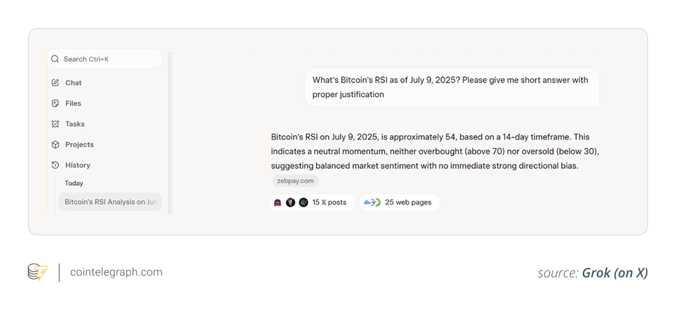 • Grok lấy dữ liệu RSI, MACD theo thời gian thực từ CoinMarketCap.
