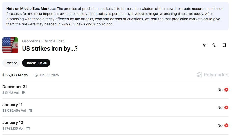 Tính đến hiện tại, các thị trường liên quan đến khả năng Mỹ tấn công Iran trên Polymarket đã thu hút khoảng 529 triệu USD khối lượng giao dịch.