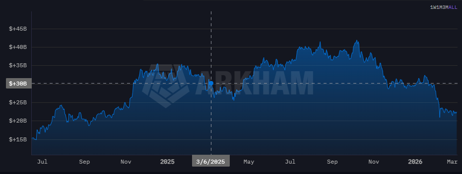 Giá trị danh mục crypto của Mỹ đã giảm mạnh kể từ tháng 3/2025. Nguồn: Arkham Intelligence.