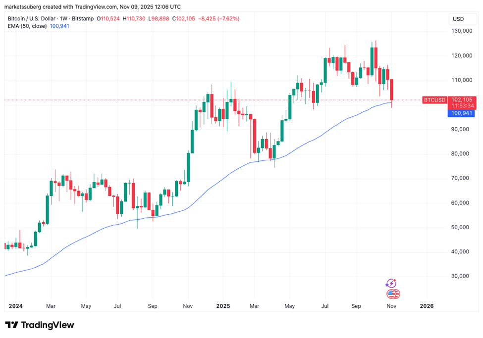 Trong khi đó, một số nhà phân tích khác lại chú ý đến đường trung bình động hàm mũ 50 tuần (50EMA) — hiện nằm tại 100.940 USD.