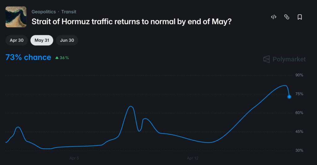 Tuyên bố từ Ngoại trưởng Iran Seyed Abbas Araghchi cho biết tuyến vận tải qua Hormuz sẽ được mở hoàn toàn trong thời gian ngừng bắn, đã đẩy tỷ lệ cược trên Polymarket lên đỉnh 82% trước khi điều chỉnh về mức hiện tại.